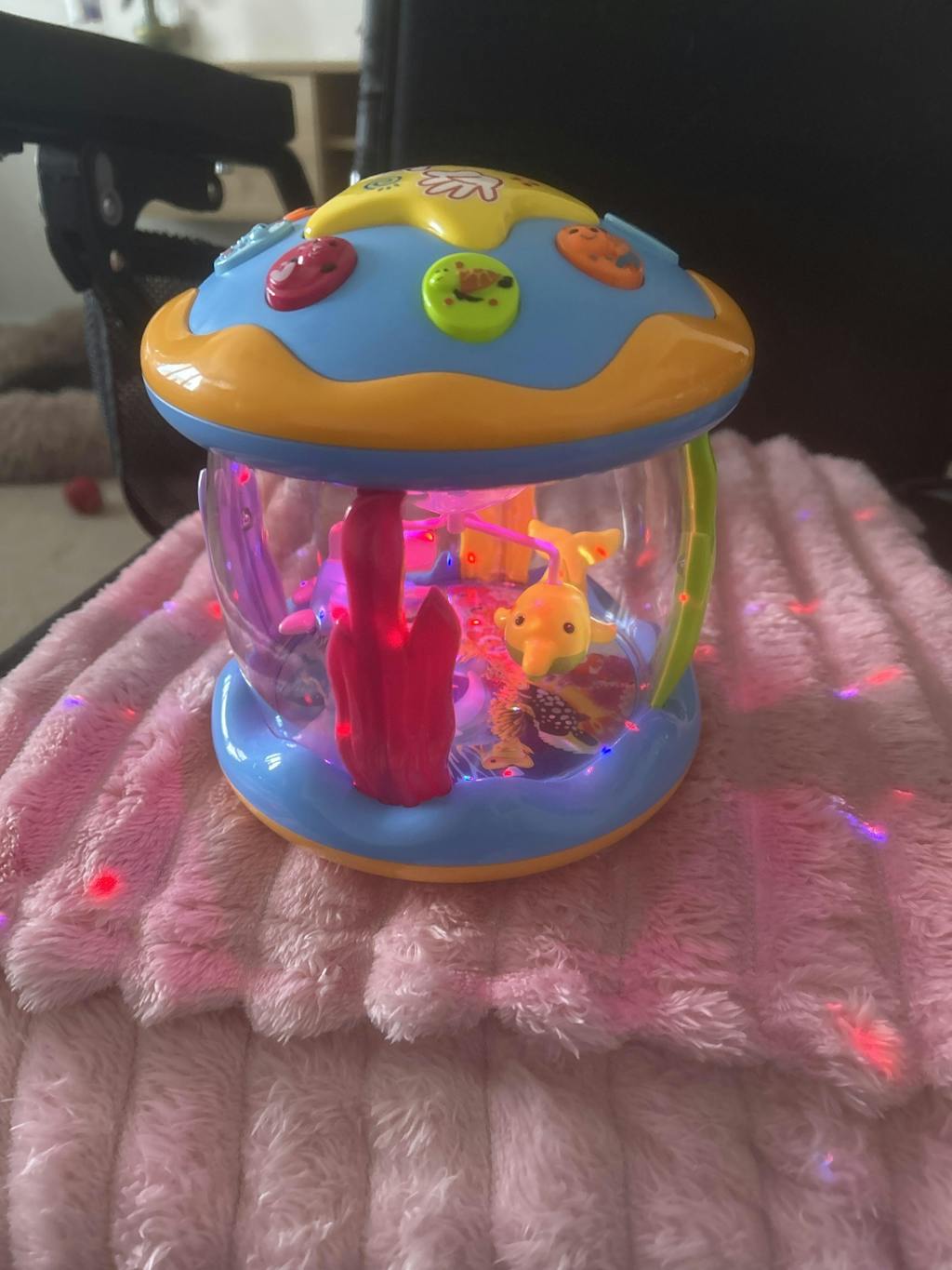 Brilliant toy, my 5 month granddaughter adores it. She loves all the different coloured buttons on top, but her favourite button is the big yellow star which puts on 3 different light shows around the toy.